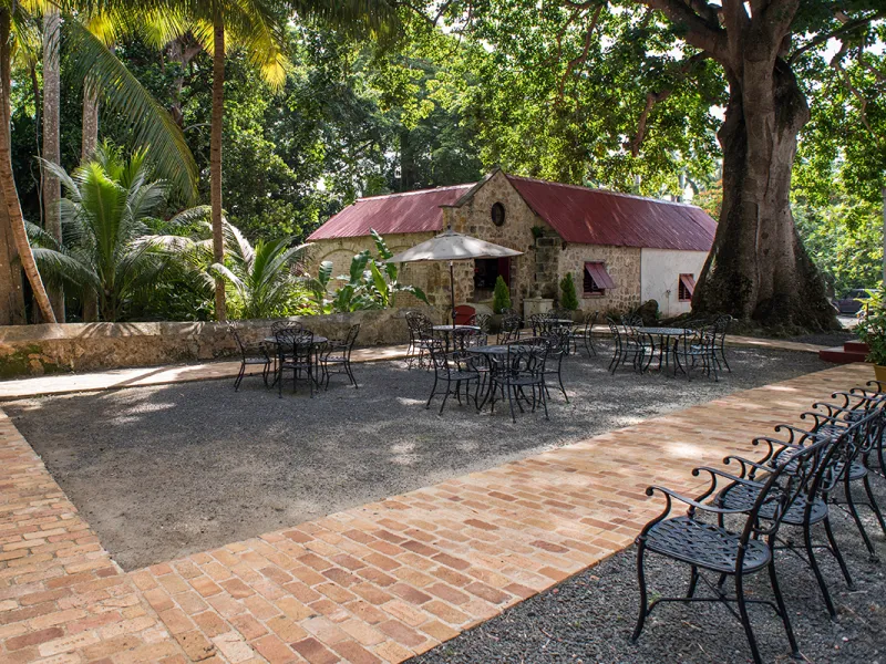 Located between the great house and rum bond, the original stable yard has been restored as a charming courtyard. Its name derives from the 400-year-old Sandbox Tree (Hura crepitans), an evergreen indigenous to the Caribbean.